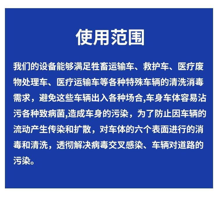 1.车辆进入清洗房,如碰到刚刚运输过生猪的车辆要经 过人工冲洗,把大量堆积在车厢内的猪粪用高压水枪进行冲洗,然后全自动360度清洗+底盘自动输送带清洗,正常人工清洗一辆装猪的车辆约2-3小时,有时会更长一些且用水量大,手动清洗完成后。“可斯迈”无接触电脑智能洗消机360度进行整车清洗、喷雾消杀,整个洗消大约1小时左右,用水1吨左右。