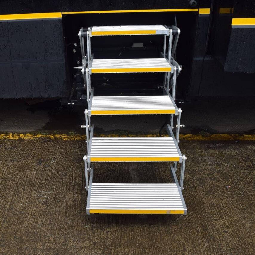 电动多级折叠踏步适用于高地板房车、特种车。可直立收存于行李舱内,占用空间少。