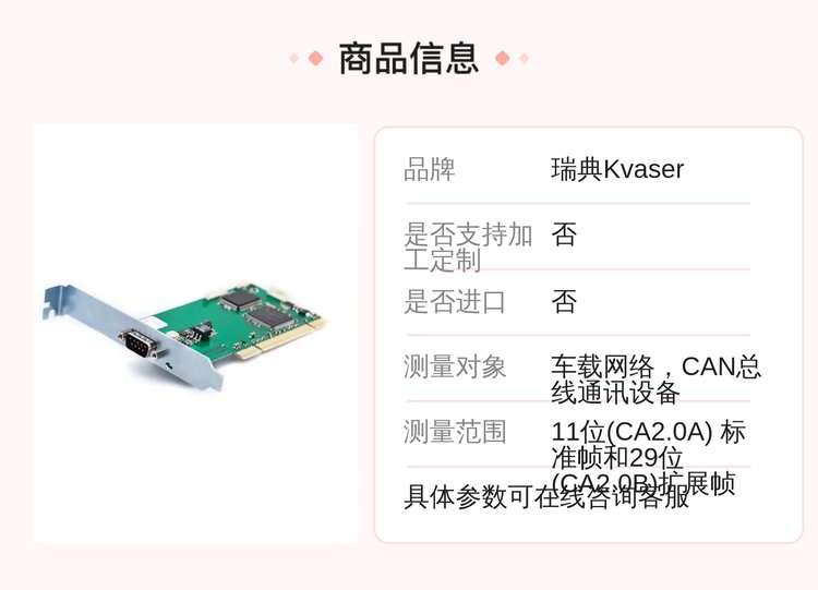 检测项目 | Kvaser PCIcanx HS是兼容PCI总线和PCI-X的一款CAN板卡 | ||