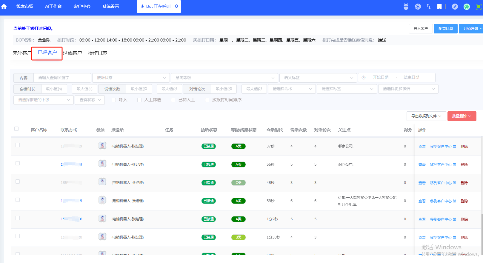 4、电话语音机器人会根据通话内容自动的分类成A、B、C类客户,自动标记未接通的电话,过一段时间会再呼叫一次。并且可以记录整个通话内容,通过文字和语音的模式记录在后台。