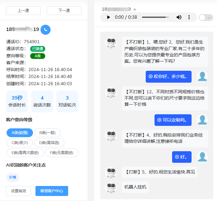 4、成本更低,永不离职智能外呼机器人只有外呼人员的10分之一成本完 美替代人工,永远不会离职!语音电话销售机器人拨打过程中, 真人录音,话术可自由定制,支持打断 ,不会回复的问题也会自动总结在后台上,越用越聪明,不必担心机械、死板等问题。同时,也有专业的客服,指导服务,辅助优化,提升效果。