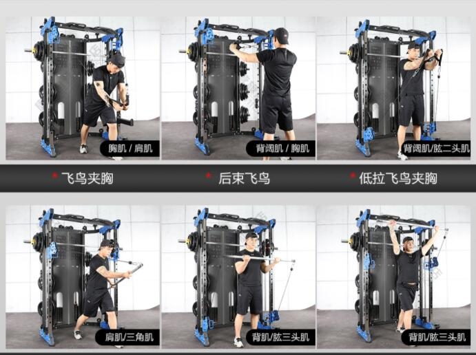 档可调节飞鸟,配合两独立配重,满足不同人群的需求,可完成上中下夹胸,坐姿划船,高度拉等训练动作!