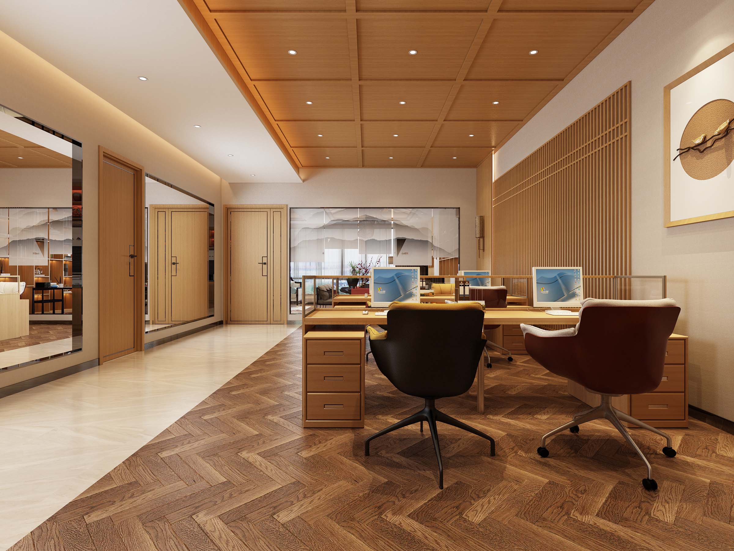 新中式办公室装修设计是一种结合了传统中式风格与现代设计元素的办公空间设计风格,这种设计风格既体现了中国传统文化的精髓,又融入了现代审美和实用性,创造出一种简洁、舒适、富有文化气息的办公环境。以下是一些新中式办公室装修设计的要点: