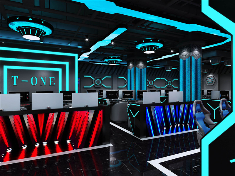 以科技、时尚、未来为主题,通过空间造型、科技设备和智能化的管理系统,打造一个充满科技感和未来感的网咖风格空间,装修设计可以从以下几个方面进行考虑: