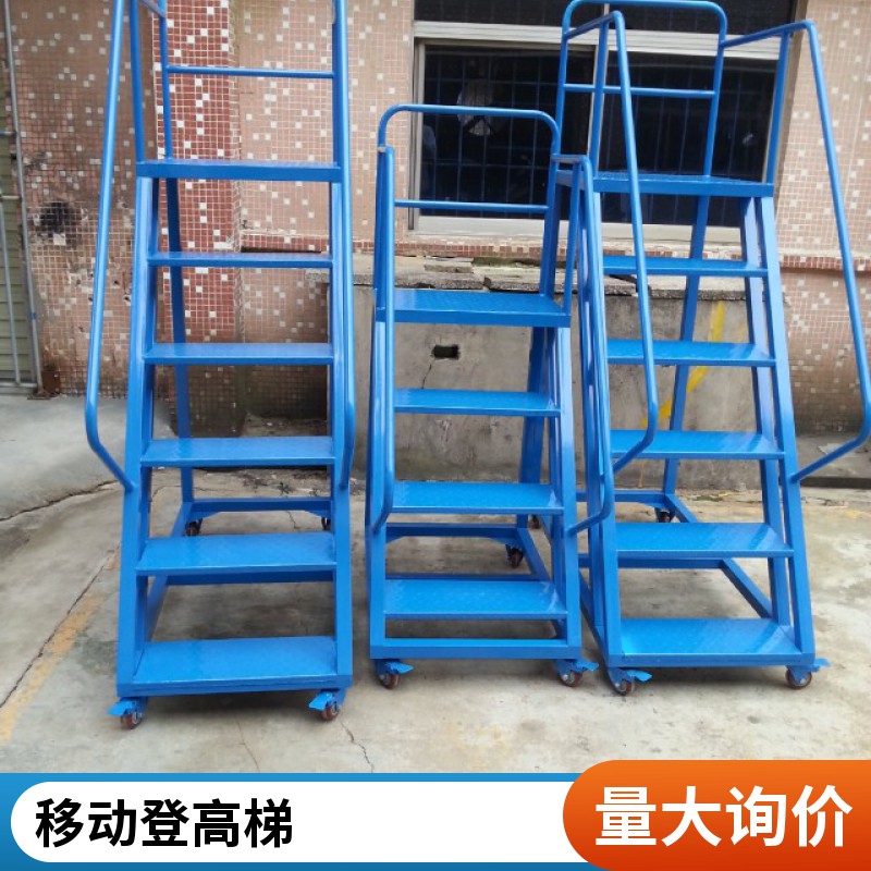货架梯是用高强度方管、角铁、钢管做为机架,防滑花纹钢板做为台阶制造而成,两个脚轮带刹车,移动灵活方便.登高梯(车):登高车采用优质钢材制造配以优质脚轮;既可做为物料搬运与周转的承载工具,又可以作为登高取货的辅助作业工具, 具有安全可靠、结构简单、方便快捷的特点;特别适合于工厂、仓库、图书、标准件等环境下轻小型物料的人工拣货作业。