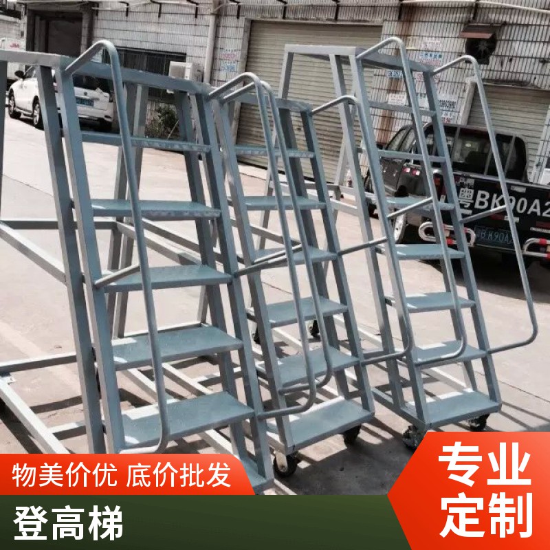 加料梯是用高强度方管、角铁、钢管做为机架,防滑花纹钢板做为台阶制造而成,两个脚轮带刹车,移动灵活方便.登高梯(车):登高车采用优质钢材制造配以优质脚轮;既可做为物料搬运与周转的承载工具,又可以作为登高取货的辅助作业工具, 具有安全可靠、结构简单、方便快捷的特点;特别适合于工厂、仓库、图书、标准件等环境下轻小型物料的人工拣货作业。